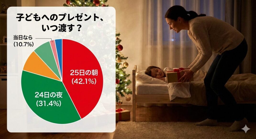 子どもへのプレゼントで最も重要なのは、日付そのものよりも「サンタクロースの魔法」を守ること。121人のパパママを対象とした調査によると、プレゼントを渡す最も人気のタイミングは以下の通りです。