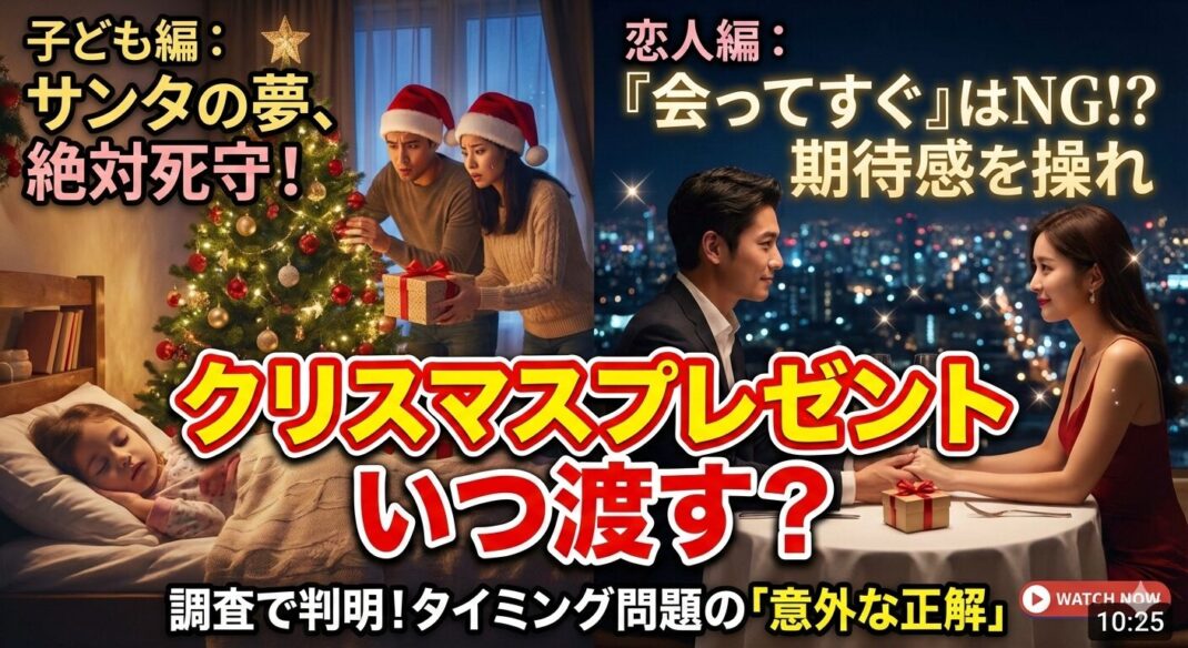 12月になると誰もが一度は頭を悩ませる問題があります。「クリスマスプレゼントって、いつ渡すのが正解なんだろう?」。この一見シンプルな問いは、相手がサンタを信じる子どもなのか、ロマンチックな一日を期待する恋人なのかによって、答えが全く変わってきます。